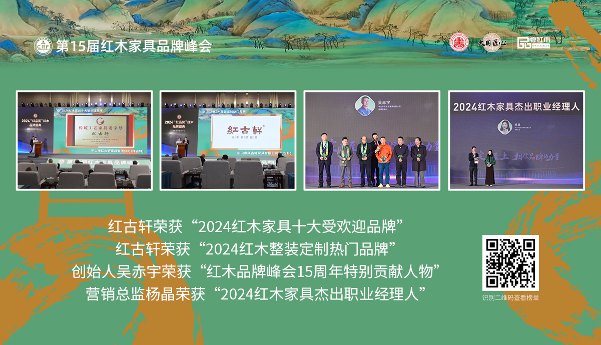 禮遇千年前的中國智慧 格物致知 修身齊家 走進(jìn)紅古軒 一廿間,二十八載。28年,跨越時代進(jìn)入新紀(jì)元;28年,待時乘勢,根深葉茂;28年,讓新中式成為時代。 創(chuàng)始人故事 1997年創(chuàng)立紅古軒,2002年在紅木行業(yè)提出“新中式紅木家具”。如今,紅古軒以富于藝術(shù)創(chuàng)造的產(chǎn)品與文化引領(lǐng)紅木家具發(fā)展... 品牌故事 品牌榮耀 品牌歷程 人物故事
